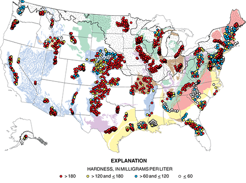 A study from the National Water-Quality Assessment (NAWQA) Project assessed water-quality conditions for about 2,100 domestic wells across the United States. Water hardness was one water-quality parameter studied; results are shown in the map to the left.